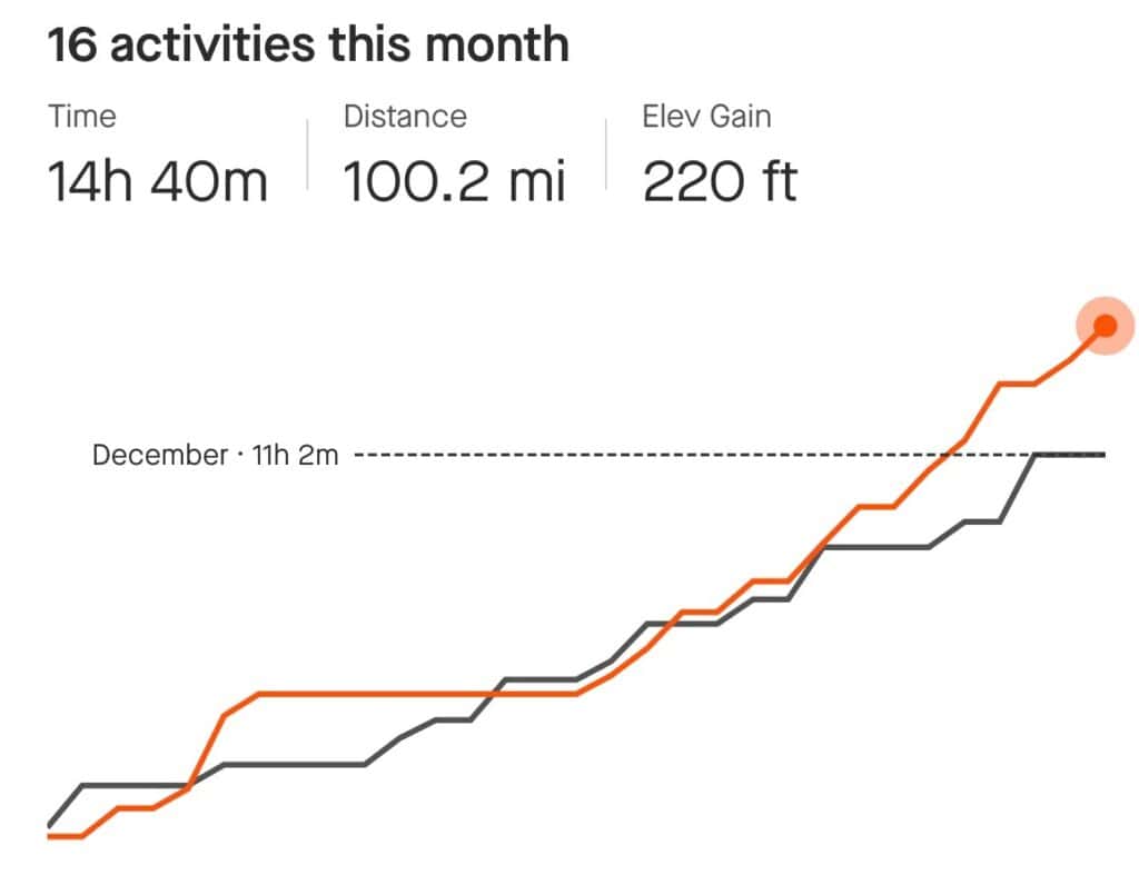 We are in the home stretch of pounding pavement and we crossed 100 miles total for the month. Crazy to look back at the beginning of this blog post and see how much I struggled to do just a single mile but here we are. What makes me even happier is that I did this while still having a bender weekend with the boys in Colorado. You can see this by the orange line being flat for almost a week.